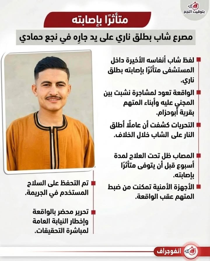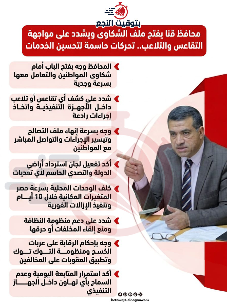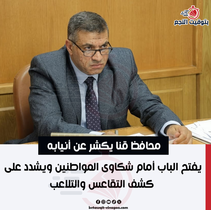 مسرح جريمة, مقالات ثابته سقوط بلطجية شارع 16.. ضبط 3 متهمين في واقعة التعدي على مهندس وتكسير سيارته بقنا نشر بواسطة admin2 أبريل 28, 2026 خدماتك, مقالات ثابته فصل التيار الكهربائي عن عدة مناطق بمدينة نجع حمادي غدًا لأعمال الصيانة نشر بواسطة admin2 أبريل 28, 2026 مسرح جريمة, مقالات ثابته حبس 3 أشهر وغرامة 20 ألف جنيه لمتهم بالسب والقذف عبر فيسبوك في قنا نشر بواسطة admin2 أبريل 28, 2026 خدماتك, مقالات ثابته محافظ قنا يعتمد جداول امتحانات نهاية العام 2026 لصفوف النقل والشهادة الإعدادية نشر بواسطة admin2 أبريل 28, 2026 مسرح جريمة, مقالات ثابته مصرع شاب متأثرًا بإصابته بعد سقوطه أسفل عجلات القطار بمحطة قنا نشر بواسطة admin2 أبريل 28, 2026 مسرح جريمة, مقالات ثابته فى حملة موسعة.. إزالة 50 حالة تعدٍ على مساحة 5575 متر مربع بقنا وأبوتشت نشر بواسطة admin2 أبريل 27, 2026 مسرح جريمة, مقالات ثابته حريق في معصرة قصب بنجع حمادي.. والحماية المدنية تتدخل قبل الكارثة نشر بواسطة admin2 أبريل 27, 2026 قصة خبر, مقالات ثابته عبد الله محمود مديرًا عامًا لإدارة الأمن الجامعي بجامعة قنا نشر بواسطة admin2 أبريل 27, 2026 مسرح جريمة, مقالات ثابته تموين قنا يضبط 305 مخالفة تموينية متنوعة خلال حملات مكبرة على الأسواق والمخابز نشر بواسطة admin2 أبريل 27, 2026 مسرح جريمة, مقالات ثابته ضبط “الميت” متلبسًا بحيازة 33 طربة حشيش وأفيون في قوص بقنا نشر بواسطة admin2 أبريل 27, 2026 مسرح جريمة, مقالات ثابته جولة مفاجئة.. وكيل صحة قنا يضبط غياب عاملين بوحدات قنا الجديدة ويُحيلهم للتحقيق نشر بواسطة admin2 أبريل 27, 2026 28 أبريل خلال اجتماع موسع.. محافظ قنا يتابع ملفات التصالح والتقنين وضبط المخالفات وتحسين الخدمات بمختلف المراكز والمدن متابعة القراءة 11 أبريل بره الشباك, مقالات ثابته محافظ قنا يبعث ببرقية تهنئة للبابا تواضروس الثاني بمناسبة عيد القيامة نشر بواسطة admin2 أبريل 11, 2026 28 أبريل مسرح جريمة, مقالات ثابته سقوط بلطجية شارع 16.. ضبط 3 متهمين في واقعة التعدي على مهندس وتكسير سيارته بقنا نشر بواسطة admin2 أبريل 28, 2026 29 مارس هن برعاية محافظ قنا.. القومي للمرأة يطلق 112 تدريبًا للتثقيف المالي ضمن مشروع “تحويشة” نشر بواسطة admin2 مارس 29, 2026 0 28 أبريل خدماتك, مقالات ثابته فصل التيار الكهربائي عن عدة مناطق بمدينة نجع حمادي غدًا لأعمال الصيانة نشر بواسطة admin2 أبريل 28, 2026 10 أبريل البرلمان, مقالات ثابته استجابة لمطلب البرلمانية رحاب الغول.. وقف القطار 1091 بمحطة نجع حمادي بداية من السبت نشر بواسطة admin2 أبريل 10, 2026 05 أبريل الدين لله, مقالات ثابته بداية أسبوع الآلام.. الكنائس تحتفل بأحد الشعانين وسط أجواء روحانية مميزة نشر بواسطة admin2 أبريل 5, 2026 0 أحدث الأخبار 28 أبريل سقوط بلطجية شارع 16.. ضبط 3 متهمين في واقعة التعدي على مهندس وتكسير سيارته بقنا متابعة القراءة 28 أبريل خلال اجتماع موسع.. محافظ قنا يتابع ملفات التصالح والتقنين وضبط المخالفات وتحسين الخدمات بمختلف المراكز والمدن متابعة القراءة 28 أبريل فصل التيار الكهربائي عن عدة مناطق بمدينة نجع حمادي غدًا لأعمال الصيانة متابعة القراءة 28 أبريل حبس 3 أشهر وغرامة 20 ألف جنيه لمتهم بالسب والقذف عبر فيسبوك في قنا متابعة القراءة 28 أبريل انطلاق أعمال المدرسة الفلكية الخامسة بجامعة قنا بمشاركة واسعة من الطلاب والمتخصصين متابعة القراءة 28 أبريل محافظ قنا يعتمد جداول امتحانات نهاية العام 2026 لصفوف النقل والشهادة الإعدادية متابعة القراءة 28 أبريل مصرع شاب متأثرًا بإصابته بعد سقوطه أسفل عجلات القطار بمحطة قنا متابعة القراءة 28 أبريل “بيطري قنا” ينجح في تحصين 91,413 رأس من الحيوانات ضد الجلد العقدي وجدري الأغنام متابعة القراءة 27 أبريل جامعة قنا تُعلن مشاركتها في “بهية النجع”.. والإعلام في قلب تكريم عظيمات مصر متابعة القراءة 27 أبريل بتوجيهات وكيل صحة قنا.. جولات ميدانية مكثفة لضبط الأداء ورفع كفاءة الوحدات الصحية متابعة القراءة 27 أبريل فى حملة موسعة.. إزالة 50 حالة تعدٍ على مس