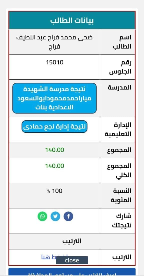 ضحى محمد فراج عبداللطيف فراج الطالبة بالصف الثالث الإعدادى بمدرسة الشهيدة ميار احمد محمود ابوالسعود الإعدادية بنات بمجموع 140 درجة.